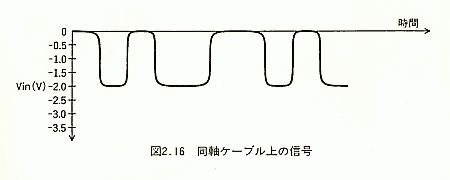 トランシーバは同軸ケーブルを電流源信号によって駆動していて、 論理値 0 または 1 がそれぞれ電流を 「流さない」または 「流す」 ことを表しています。 1台のトランシーバは約40mAの電流を流し (シールドを基準点にして同軸ケーブルの中心導体からトランシーバ へと負の電流が流れる)、同軸ケーブルの中心導体とシールドの電位差は 約2Vになります。
