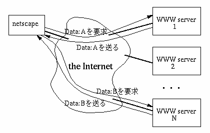 WWWクライアント(ブラウザ)は、サーバに要求を送ります。 要求には何種類かありますが、最も一般的なのはGET要求で、 「サーバ内のデータの位置」と「プロトコルのバージョン」を 指定して情報を送ってもらいます。