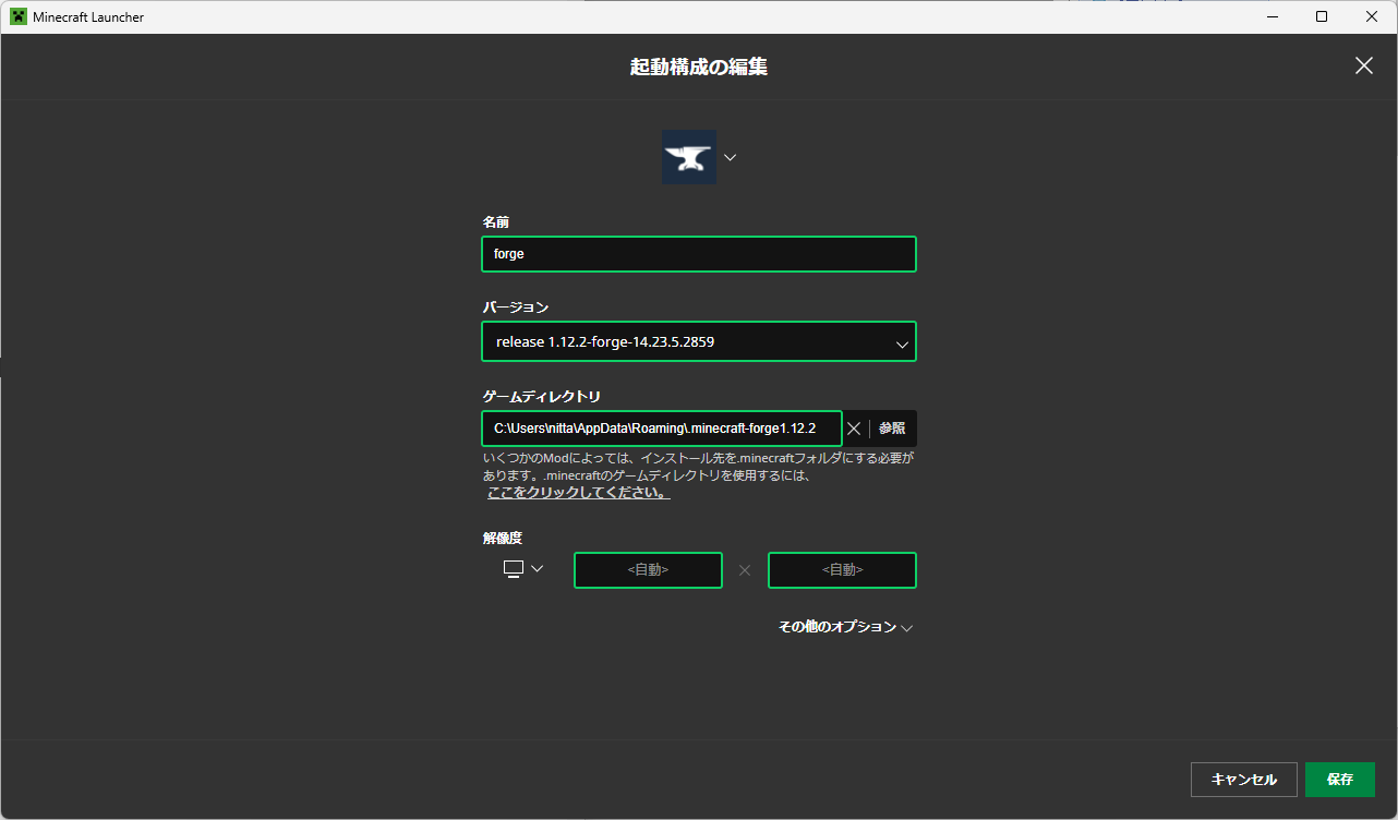 - 参照先が ".minecraft-forge1.12.2" になっていることを確認して、「保存」をクリックする。