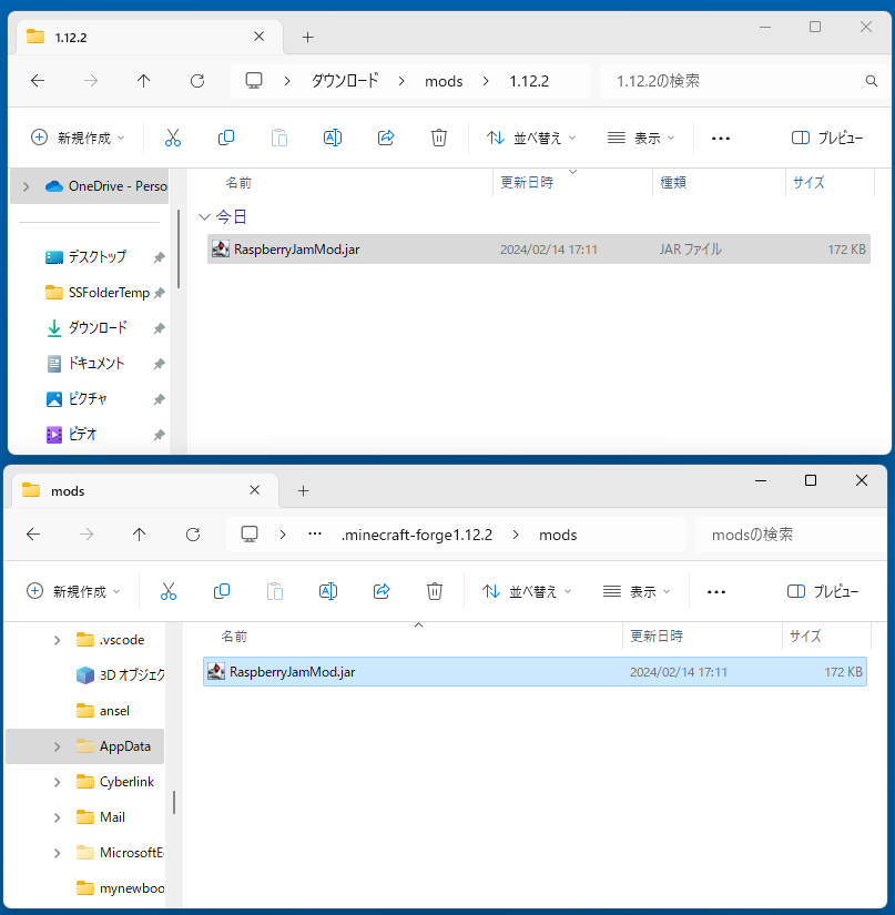 - "1.12.2" フォルダの中の RaspberryJamMode.jar を、エクスプローラーで先ほど開きっぱなしにしてあった "mods" フォルダにコピーする。
