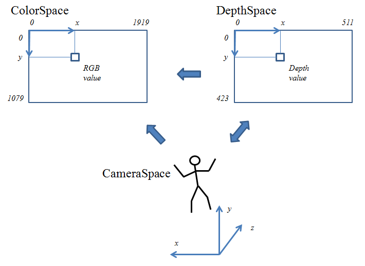 RGB画像, Depth画像, 関節情報ではそれぞれ使っている座標系が異なります。 RGB画像の座標系は ColorSpace で、Depth画像の座標系は DepthSpace, 関節情報の座標系は CameraSpace です。
