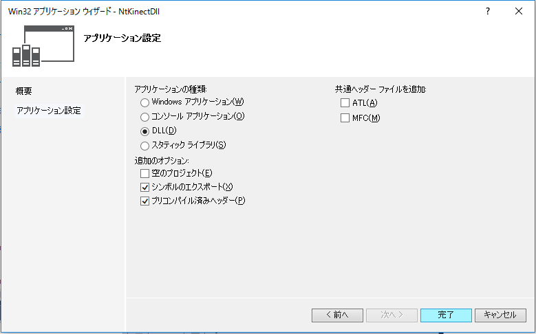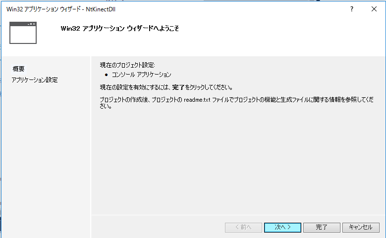 名前はここでは NtKinectDll とします。ソリューション名も自動的に NtKinectDll となります。 OK -> 次へ を選択して「アプリケーションの設定」へ