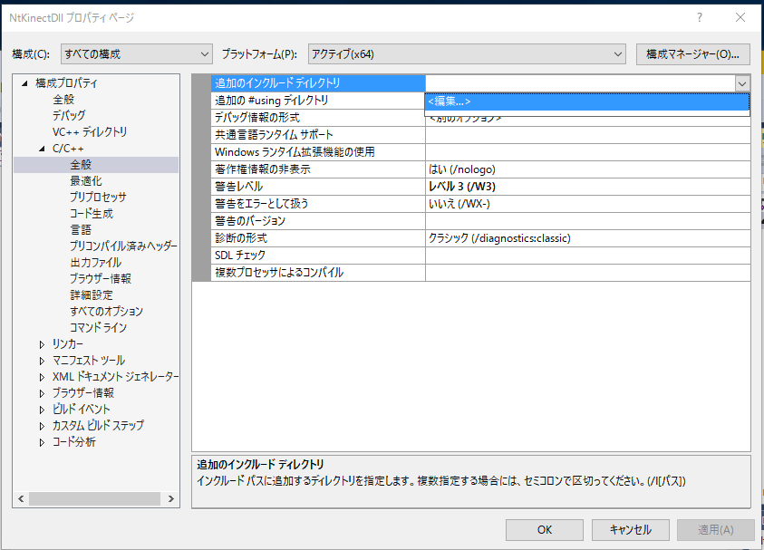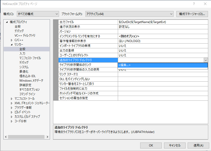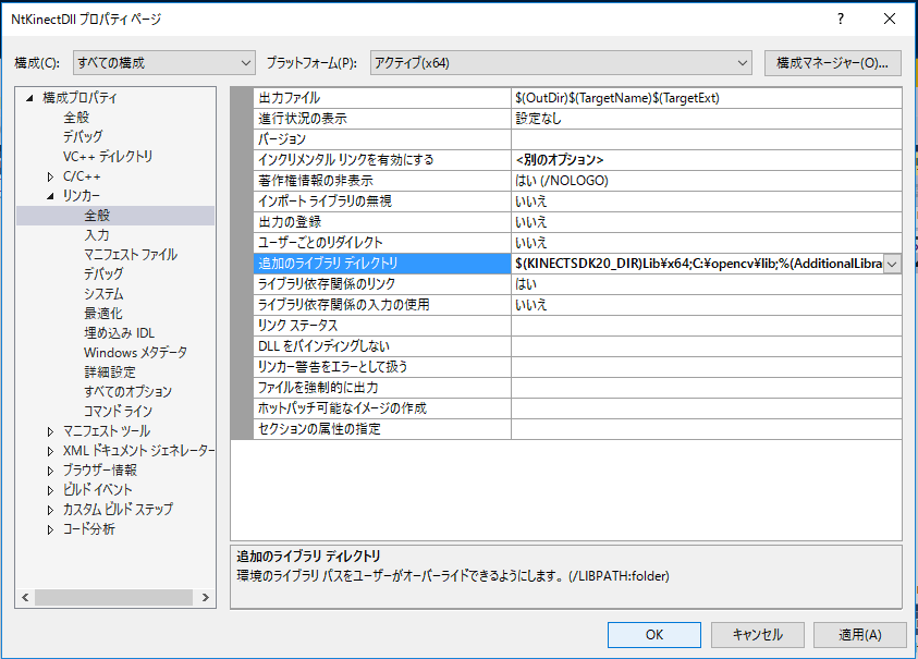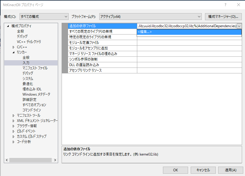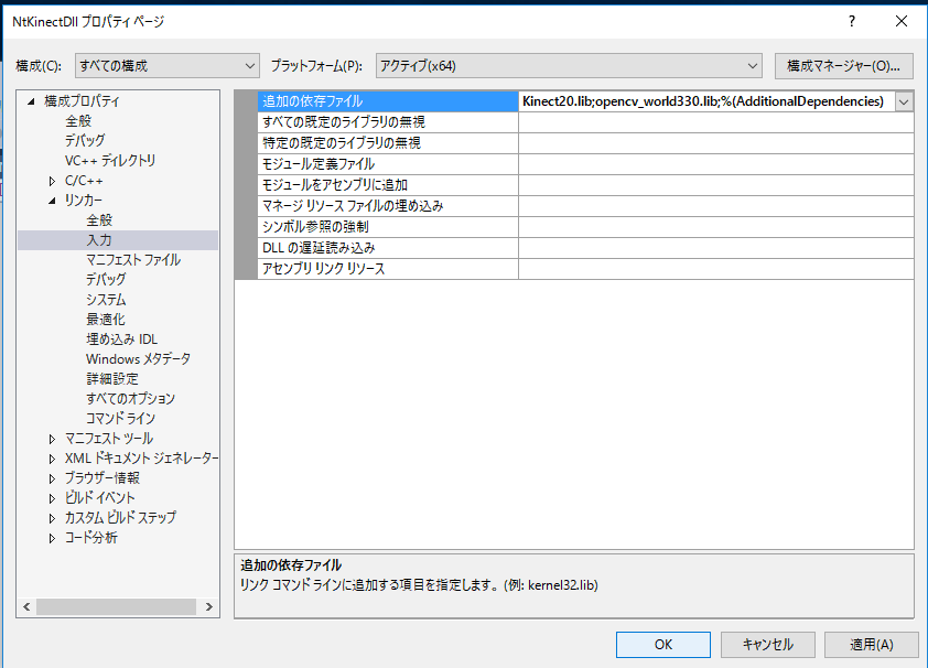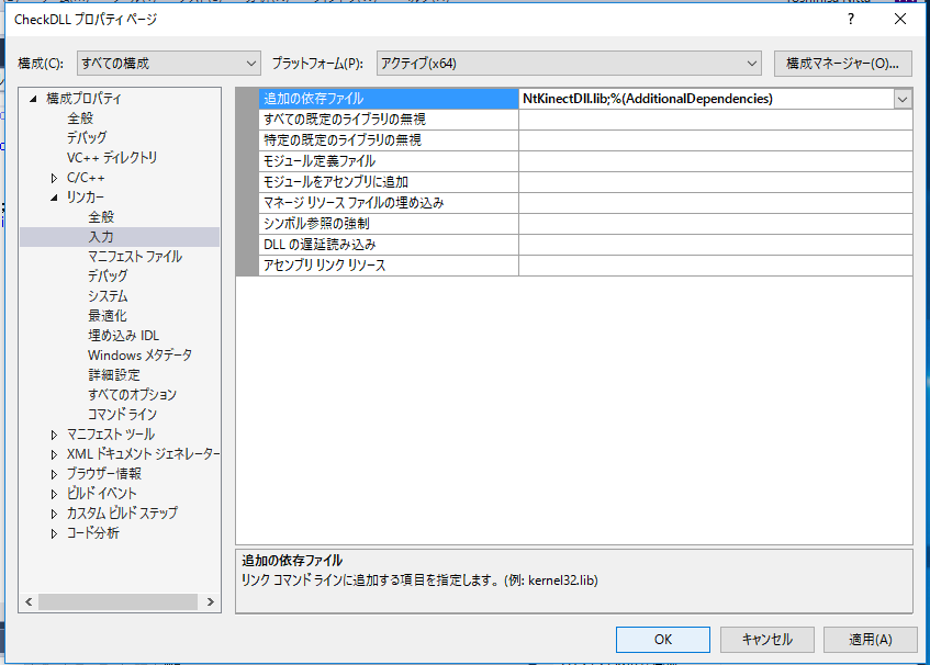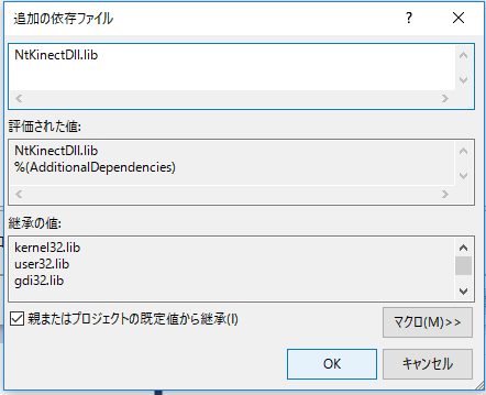 「プロジェクトのプロパティ」から「リンカー」->「入力」->「追加の依存ファイル」 に NtKinectDll.lib を追加します。