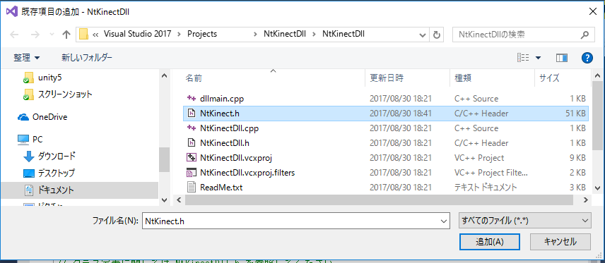 上記のリンクから NtKinect.h をダウンロードして下さい。 dllmain.cpp などプロジェクトのソースが置かれているフォルダ(この例だと NtKinectDll/NtKinectDll)に NtKinect.h を配置してから、 「ソリューションエクスプローラ」の「ヘッダーファイル」の上で右クリックで 「追加」 -> 「既存の項目」 -> NtKinect.h を選択します。