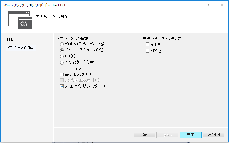 名前を CheckDLL にしてから、 OK -> 次へ を選択して「アプリケーションの設定」へ