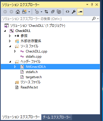プロジェクトの stdafx.cpp や CheckDLL.cpp が置かれているフォルダに NtKinectDll.dll と NtKinectDll.lib をコピーします。