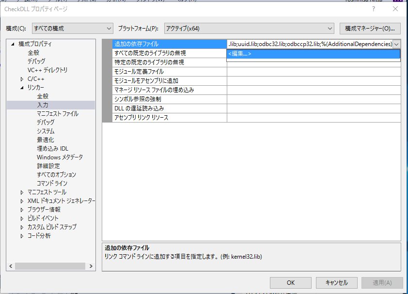 「構成プロパティ」 -> 「リンカー」 -> 全般 -> 入力