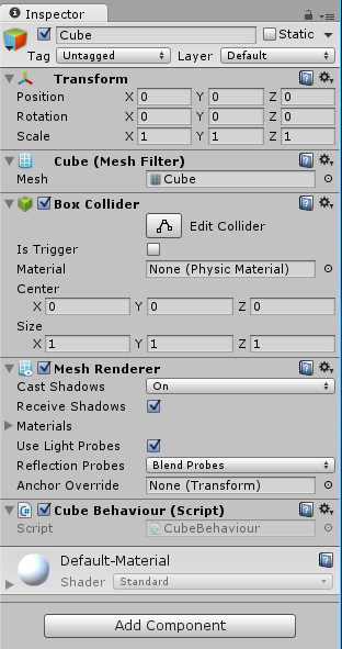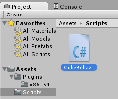 上部のメニューから「Assets」-> 「Create」 -> 「C# Script」 -> ファイル名は CubeBehaviour