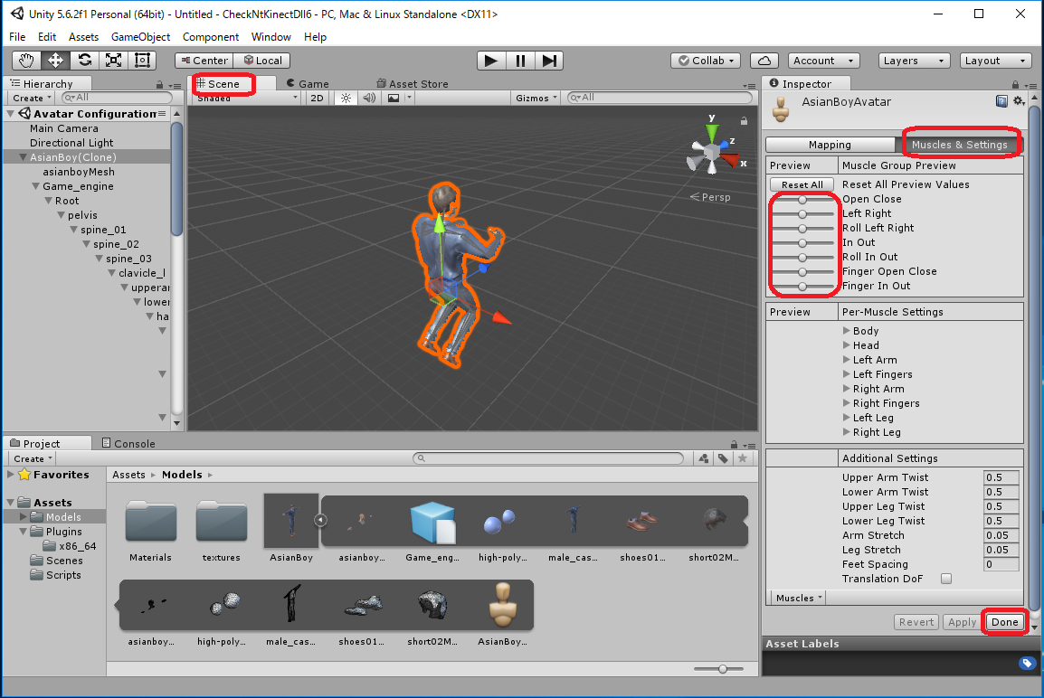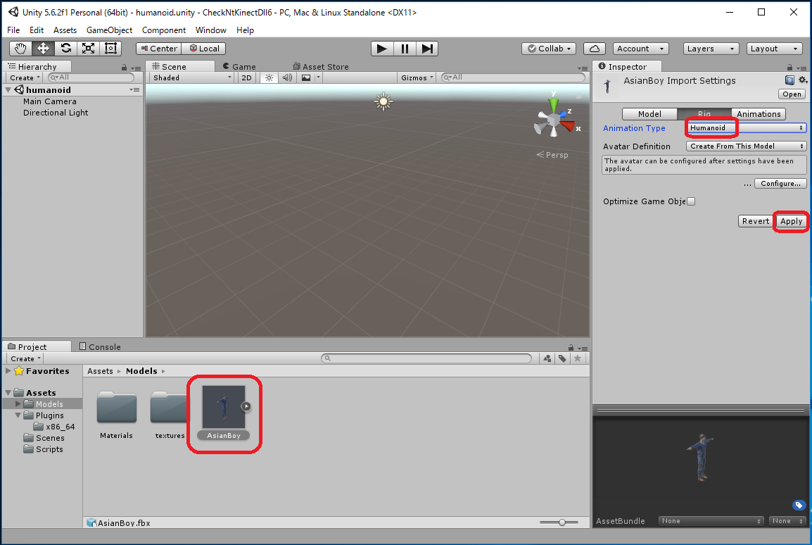 Assets -> Import New Asset... -> AsianBody.fbxから行なってもよいのですが、これだとAsianBoy.fbx に必要なtextureが 自動ではimportされず、モデルが真っ白になってしまいます。 この場合は Assets/Models/Materials/に生成された白いMaterialに対応する Textureを手動でimportしなくてはいけません。