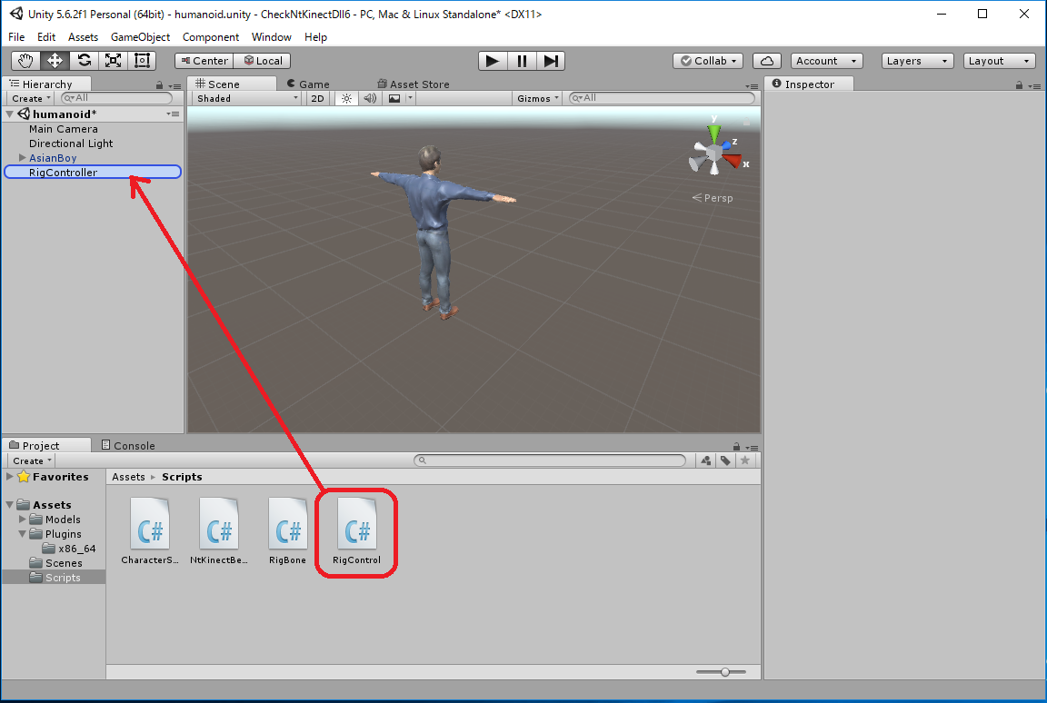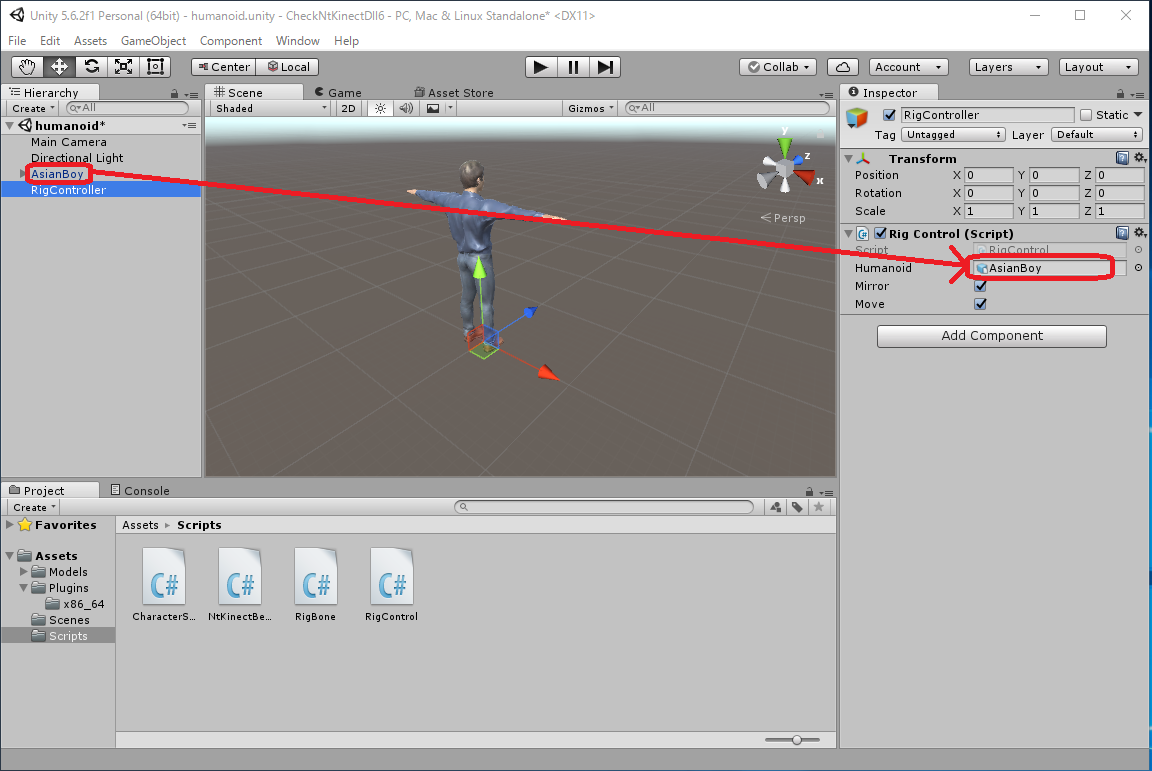 RigController に付加されている "Rig Control (Script)" コンポーネントの mirrored がチェックされていると、 人間の鏡像の動きに追随します。 mirrored のチェックをはずすと Humanoid はカメラに背を向けて、人間の動きに そのまま追随するようになります。 (注)実行中のUnityのウィンドウの右に小さく表示されているKinect V2の認識中の画面は すでに鏡像になったものです。