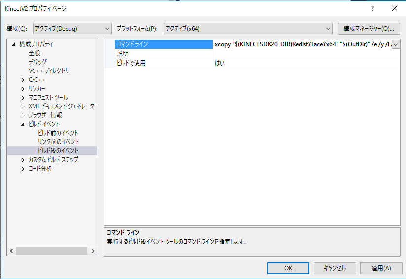 4. 実行時に必要なファイル(Kinect20.Face.dll)をコピーする必要があるため、 「構成プロパティ」->「ビルドイベント」->「ビルド後イベント」->「コマンドライン」 に次のコマンドを追加するように、プロジェクトを変更して下さい。