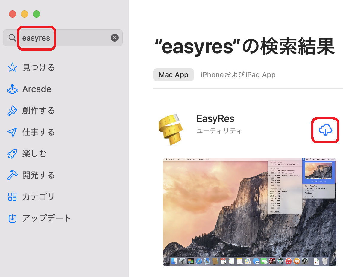 AppStore ウィンドウの左サイドビューにある検索窓で easyres を検索し、検索された EasyRes ユーティリティをインストールする。