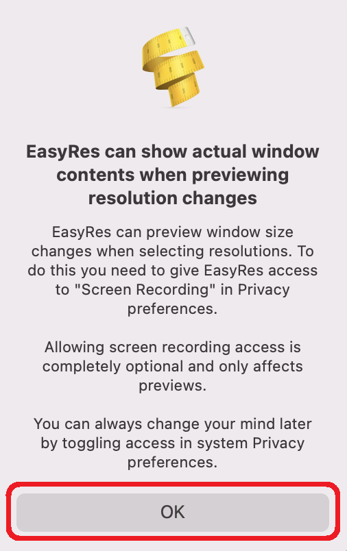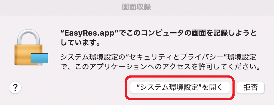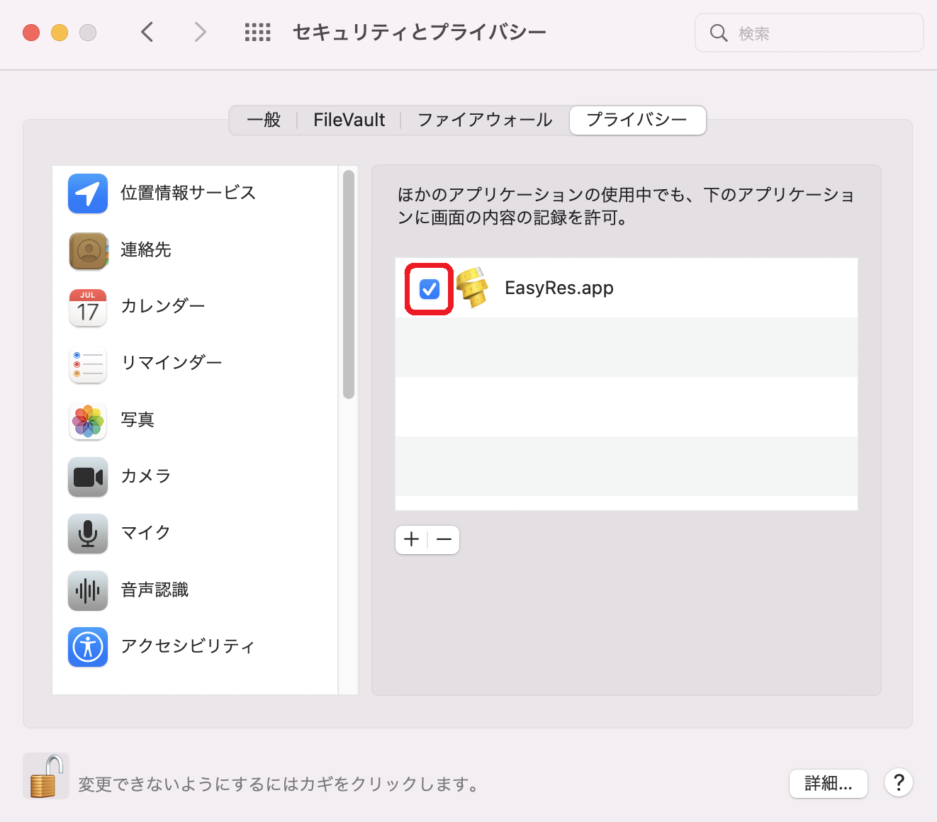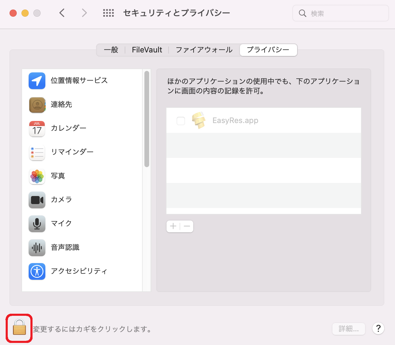 EasyRes.app に「画面の内容の記録を許可」を与えるために、画面左下のカギをクリックする