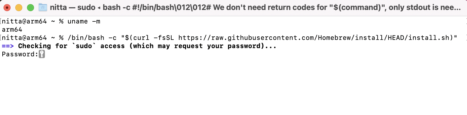(arm64)% /bin/bash -c "$(curl -fsSL https://raw.githubusercontent.com/Homebrew/install/HEAD/install.sh)"