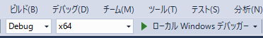 Visual Studio のウィドウ上部のメニューバーの中央付近に、コンパイルオプションを指定するウィンドウがありますので "x64" に変更します。