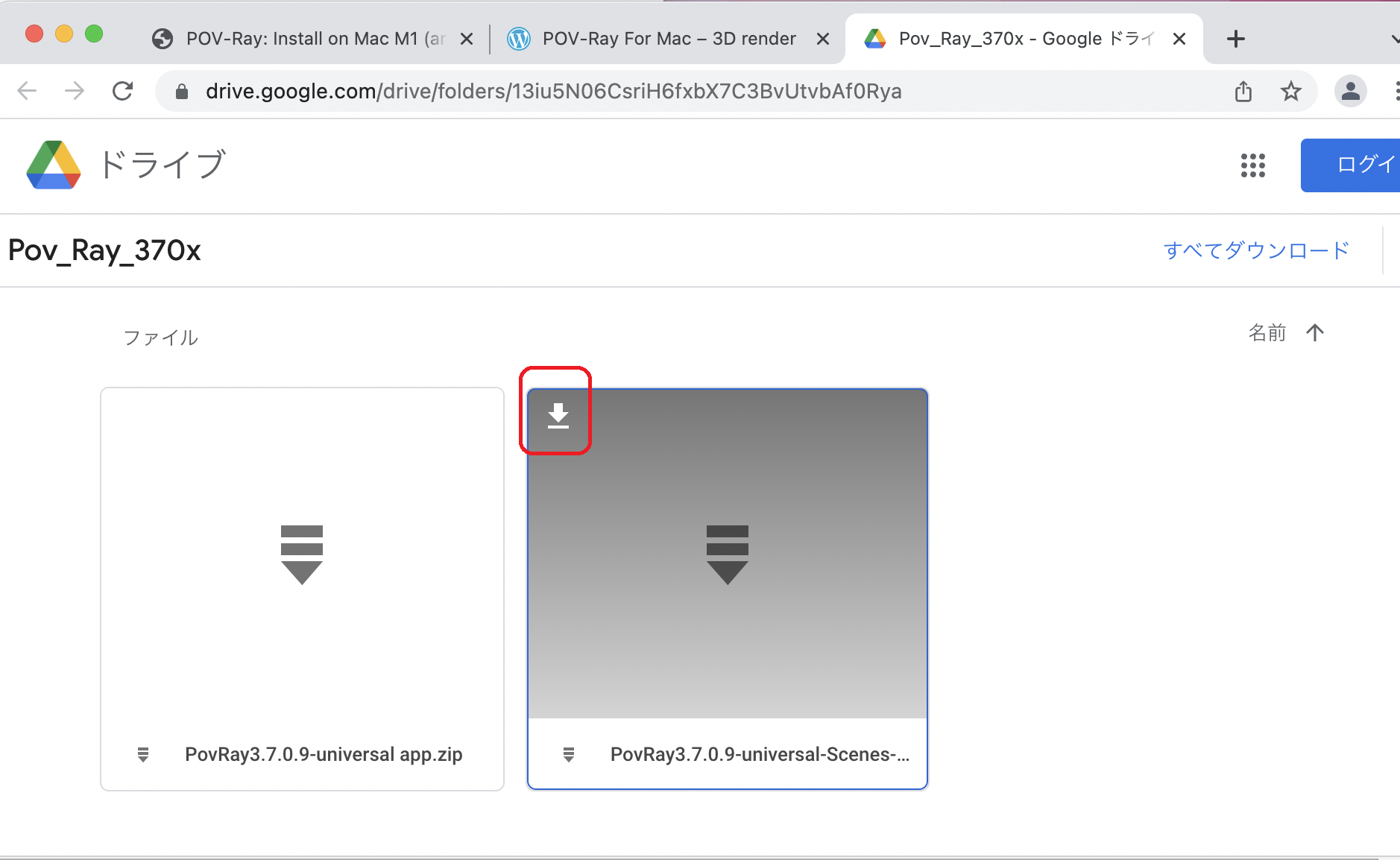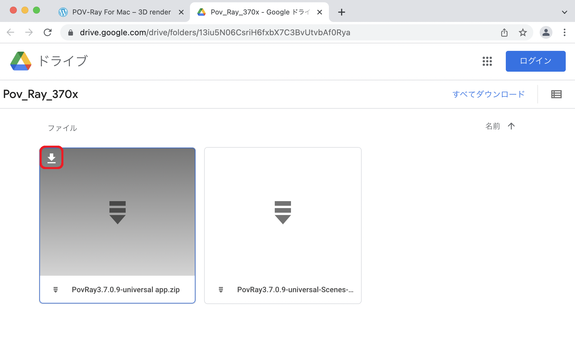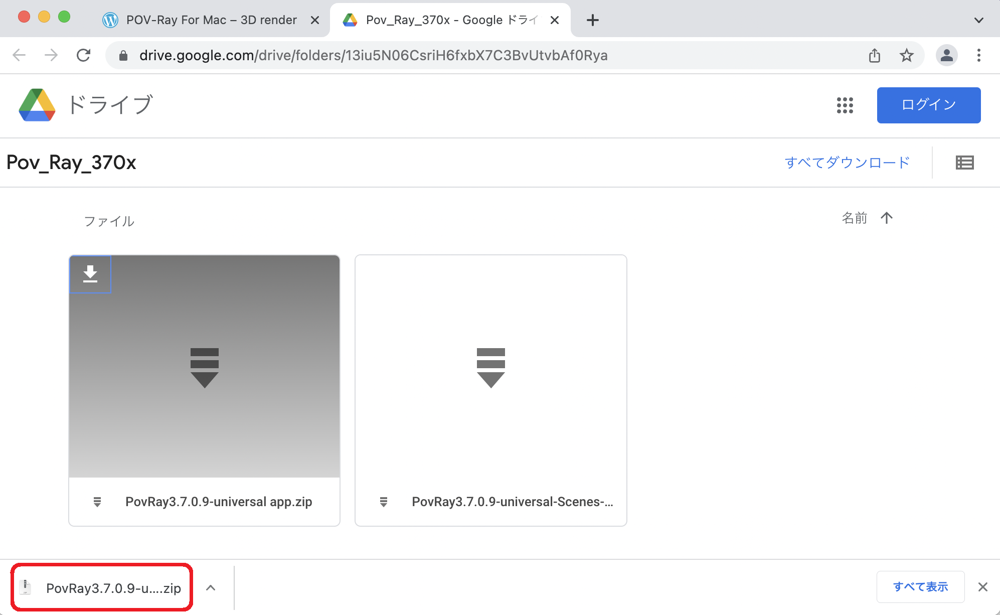 - chromeブラウザの場合は、ダウンロードした "PovRay3.7.0.9-universal app.zip" ファイルがウィンドウ下部に表示されるので、それをクリックすると展開して PovRay3.7.0.9-universal app/ フォルダが作成される。