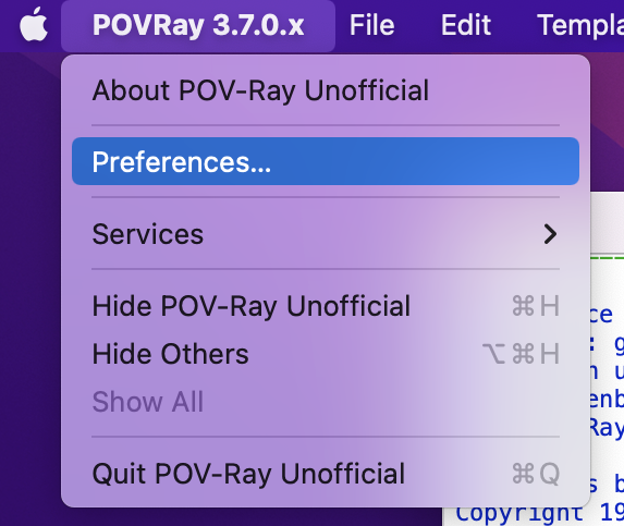 - POVRay の実行中に、画面上部のメニューから "POVRay 3.7.0.x" → "Settings..." (または "Preferences" )を選択する。