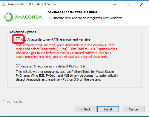 「環境変数のPATH に含める(Add Anaconda to my PATH environment variable)」