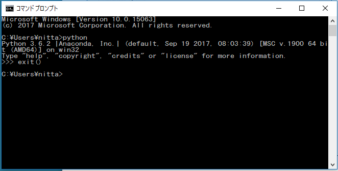 インストールが終了した後で起動したコマンドプロンプトでは PATH が設定されているので、pythonとタイプすると python (version 3)が起動する。