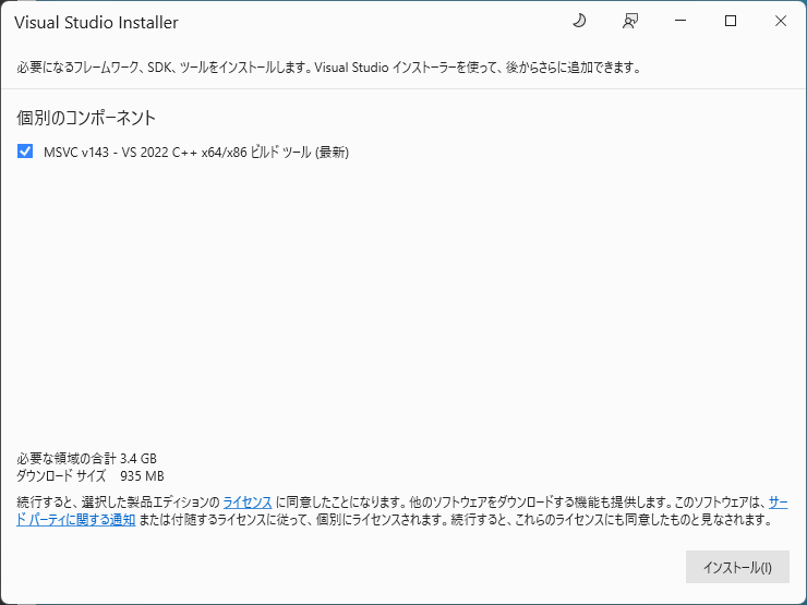 - 表示される指示にしたがって Visual Studio Community をインストールする。