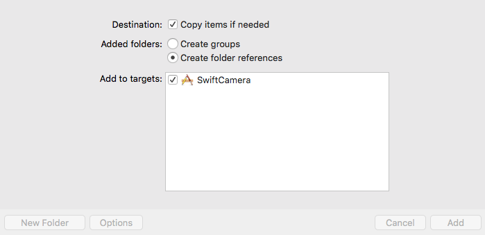 ダウンロードした "AKPickerView.swift" を選択して "Add" ボタンをクリックすると、ファイルがプロジェクトに追加されます。 このときOptionsをクリックして、"Destination: [ ] Copy items if needed" にチェックをつけておくこと(重要)。