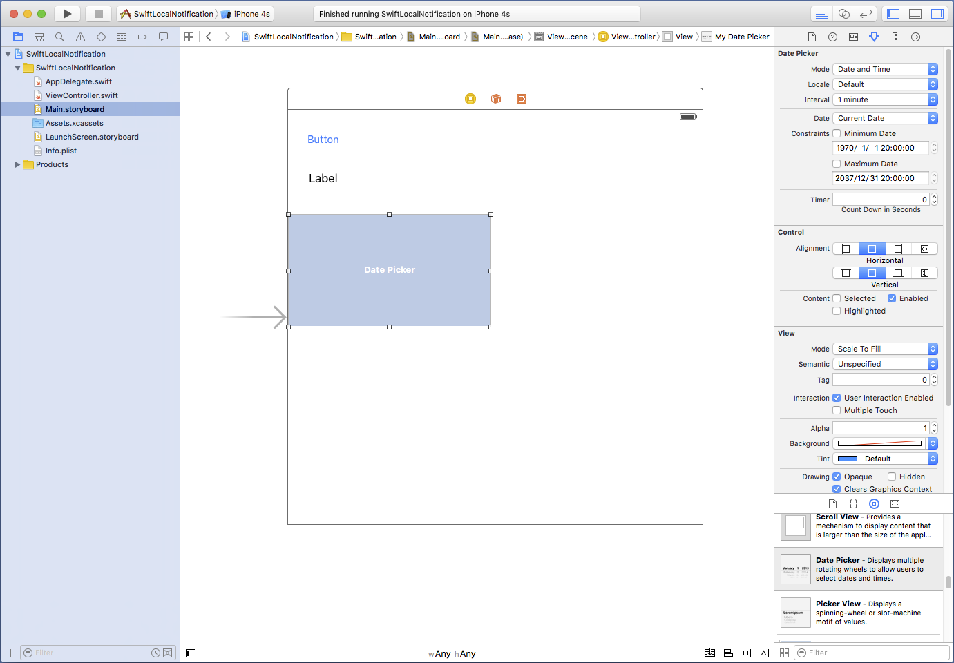 上記の例では、現在時刻から数秒後に通知を設定していました。 特定の日時にローカル通知が来るように設定してみます。