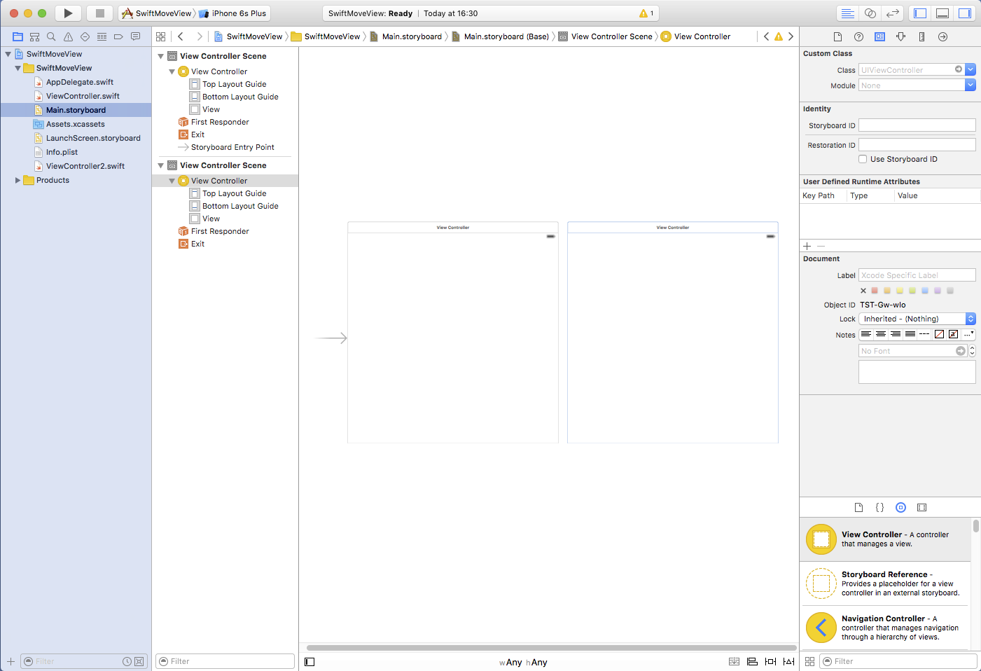 project navigator のプロジェクト名の上でマウスを右ドラッグして "New File..." を選択します。 iOS の Source で Cocoa Touch Class を選んで Next をクリックします。 Class: には "ViewController2", Subclass of: には "UIViewController" Language: には "Swift" を選びます(クラス名は自由に選んで構いません)。 ViewController2.swift がプロジェクトに追加されます。