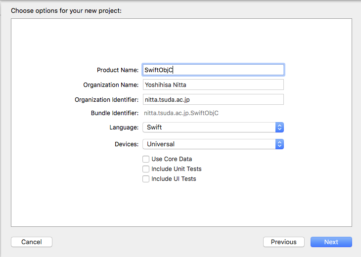 このあと「SwiftとObjective-Cをブリッジ(橋渡し)するHeaderを作るか」と確認を求められるので "Create Bridging Header" を選択します。 ブリッジングヘッダーファイルの名前は「プロジェクト名-Bridging-Header.h」となります。