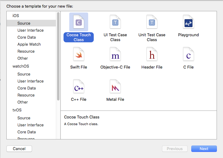 project navigator のプロジェクト名の上でマウスを右ドラッグして "New File..." を選択します。 iOS の Source で Cocoa Touch Class を選んで Next をクリックします。 Class: には "ViewController2", Subclass of: には "UIViewController" Language: には "Swift" を選びます(クラス名は自由に選んで構いません)。 ViewController2.swift がプロジェクトに追加されます。