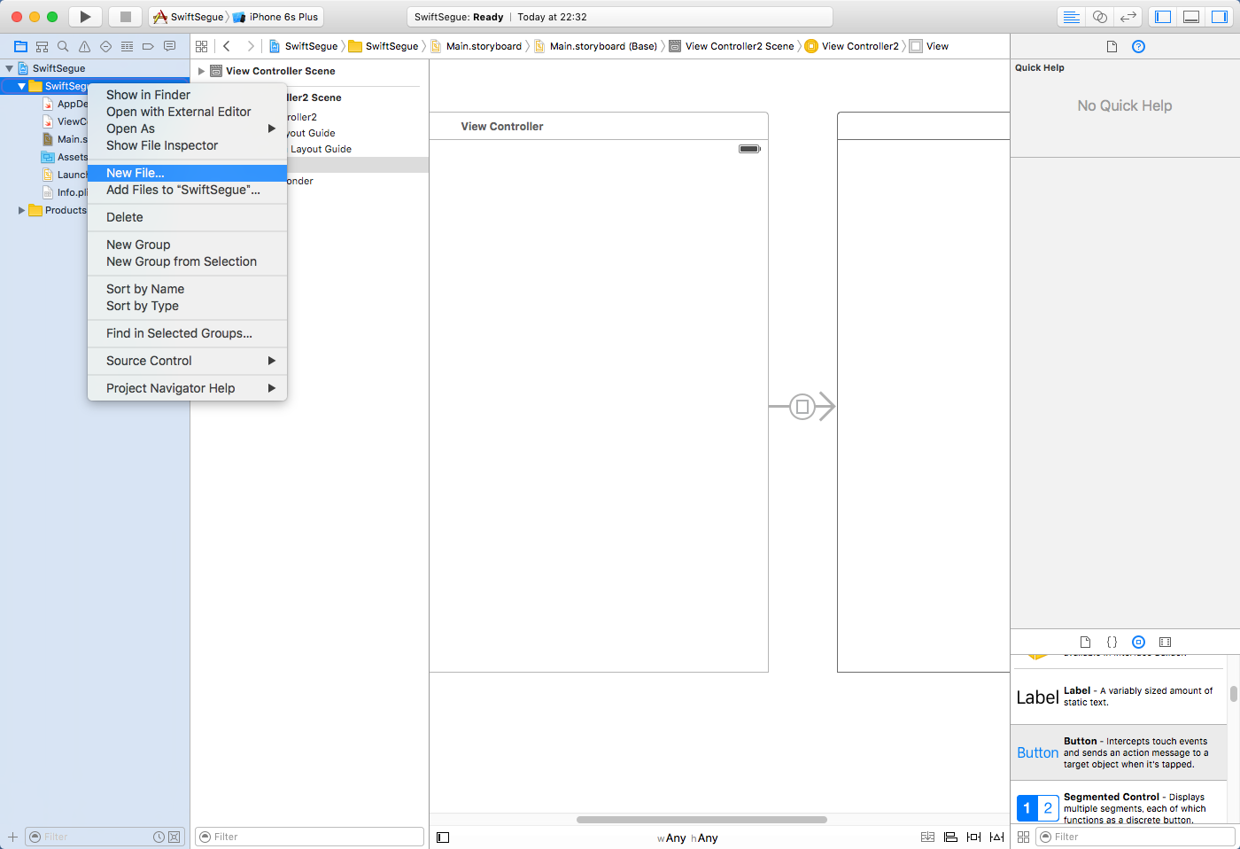 9. ViewController2.swift が生成されるフォルダは、他のファイルと同じく SwiftSegue のままで構わない。