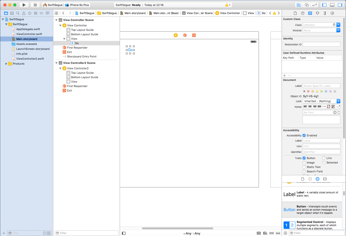 3. Main.storyboard上の ViewController の中に、ウィンドウ右下の "Object library" から "Button" をドラッグして配置します。Buttonのtextは "Go" に変更しました。