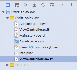project navigator のプロジェクト名の上でマウスを右ドラッグして "New File..." を選択します。 iOS の Source で Cocoa Touch Class を選んで Next をクリックします。 Class: には "ViewController2", Subclass of: には "UIViewController" Language: には "Swift" を選びます(クラス名は自由に選んで構いません)。 ViewController2.swift がプロジェクトに追加されます。