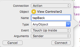 | "Back" Button | Action (Touch Up Inside) | tapBack()関数 |