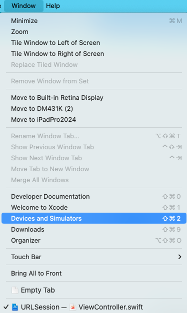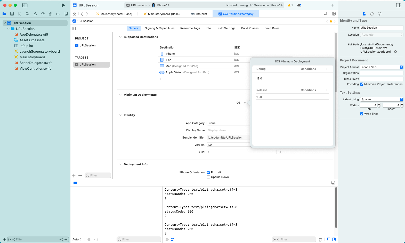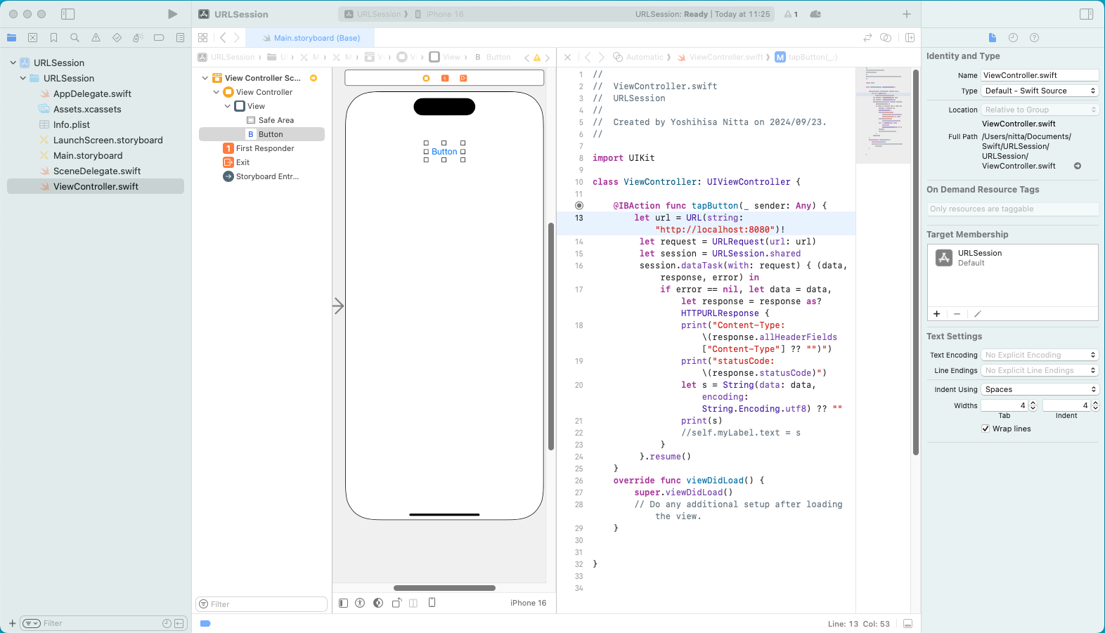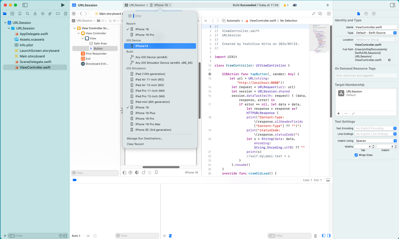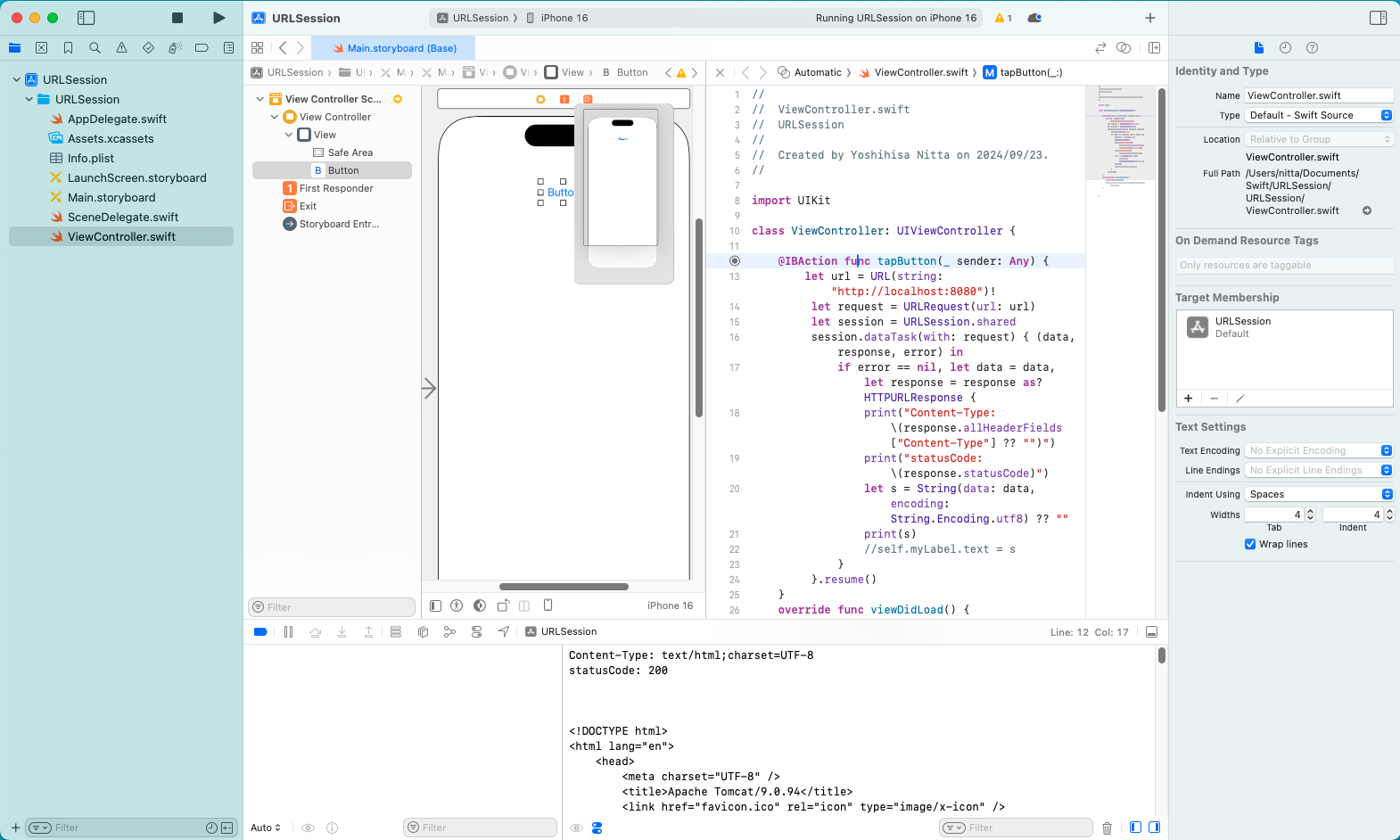 同一マシン上に tomcat が動作している場合は、Xcode のConsole に結果が表示される。 Webサーバに正しくアクセスできた場合は status code として 200 が返される。