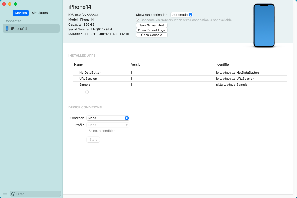 iOS デバイスを最初に接続した時は、かなり大量のデータを Mac に吸い上げるため、認識されるまでに時間がかかる。 {2度目以降は、すぐに認識されて 'Connected' を表示され、実行デバイスとして選択できるようになる。
