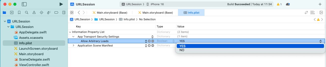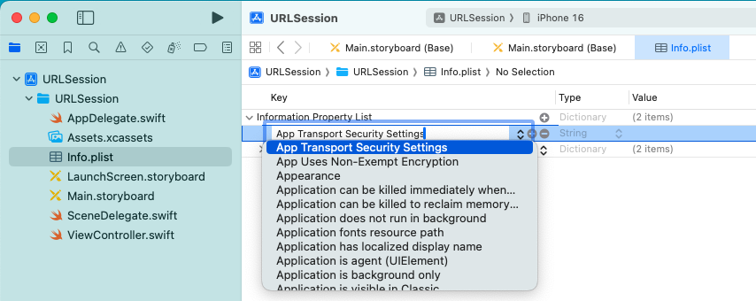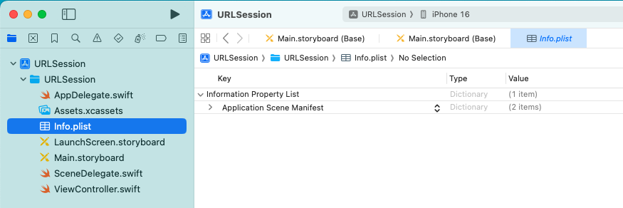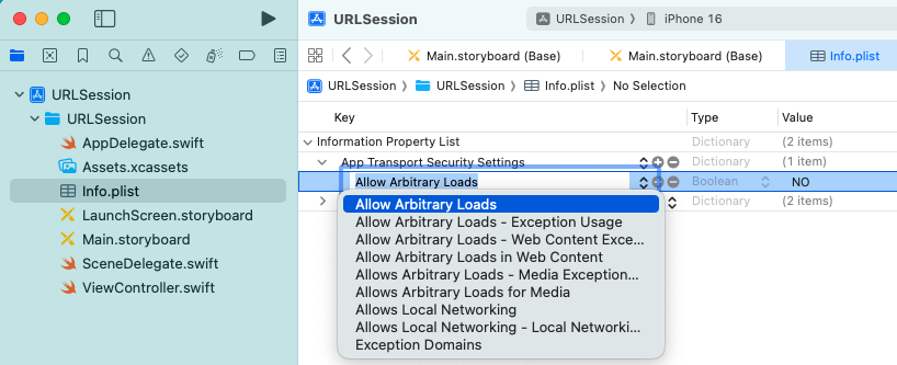 iOS 9 (2016) 以降は、iOS のアプリの Web アクセスは https を使うことが推奨され、基本的に http アクセスはできなくなった。 今回は開発用でもあり、簡単のため、危険性を理解した上で ATS を無効化し、 http アクセスを使うことにする。 具体的には Info.plist に次のエントリを追加する。
