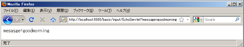 http://localhost:8080/basic/input/EchoServlet?message=goodmorning にアクセスをしてみましょう。 ただしくEchoServletで処理されてmessage="与えたデータ"が表示されると思います。