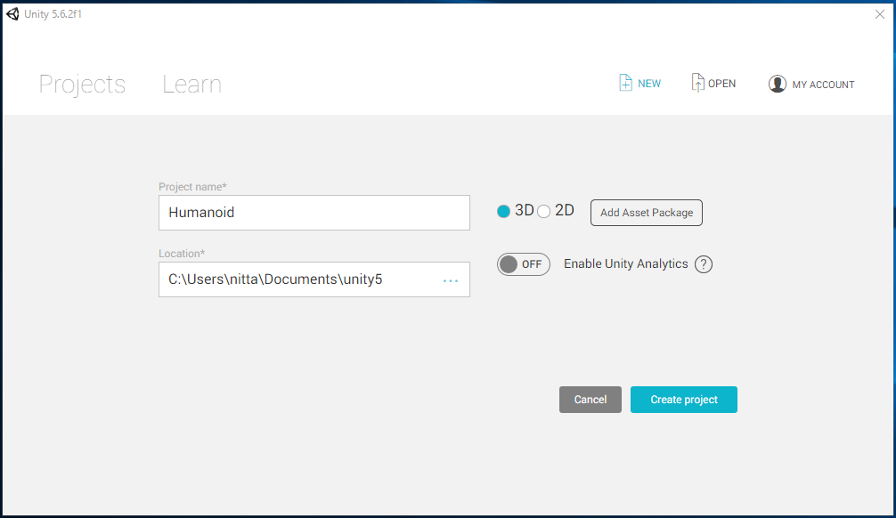 "Humanoid" という "3D" 形式のプロジェクトを NEW しています。