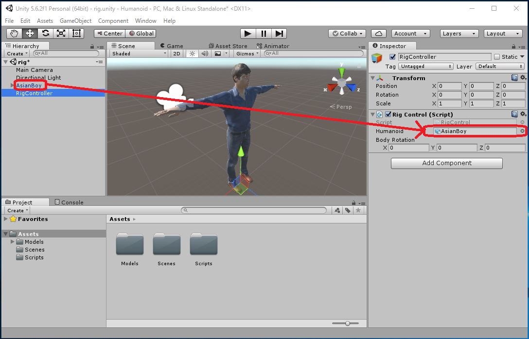 Assets -> Import New Asset... -> AsianBody.fbxから行なってもよいのですが、これだとAsianBoy.fbx に必要なtextureが 自動ではimportされず、モデルが真っ白になってしまいます。 この場合は Assets/Models/Materials/に生成された白いMaterialに対応する Textureを手動でimportしなくてはいけません。