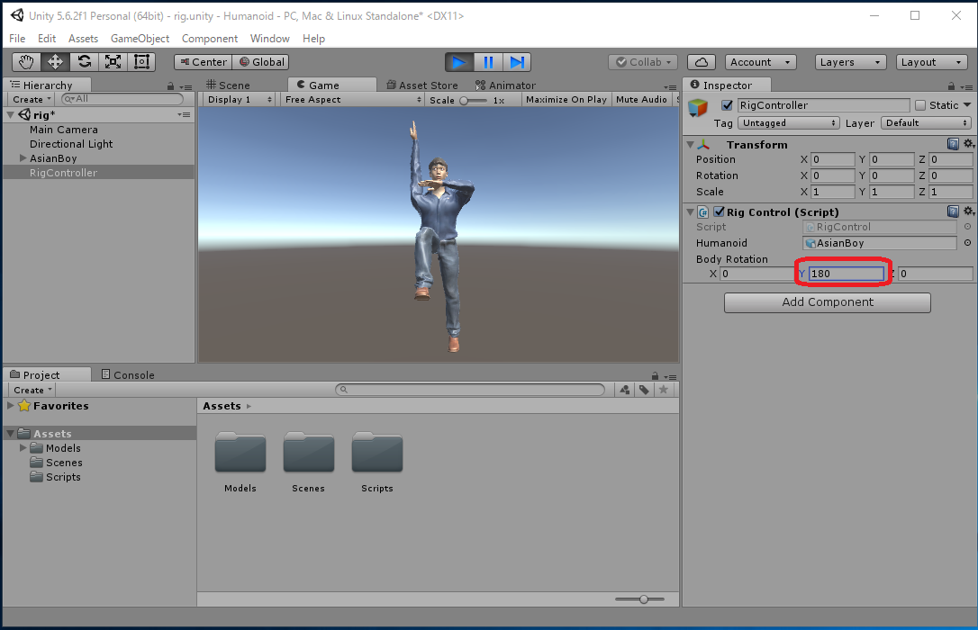 プログラムを実行中にHierarchy ウィンドウで RigController を選択して、 RigController の Inspector ウィンドウ中の "Rig Control 2 (Script)" コンポーネントの BodyRotation を (X,Y,Z)=(0,180,0)にするとカメラ方向を向きます。