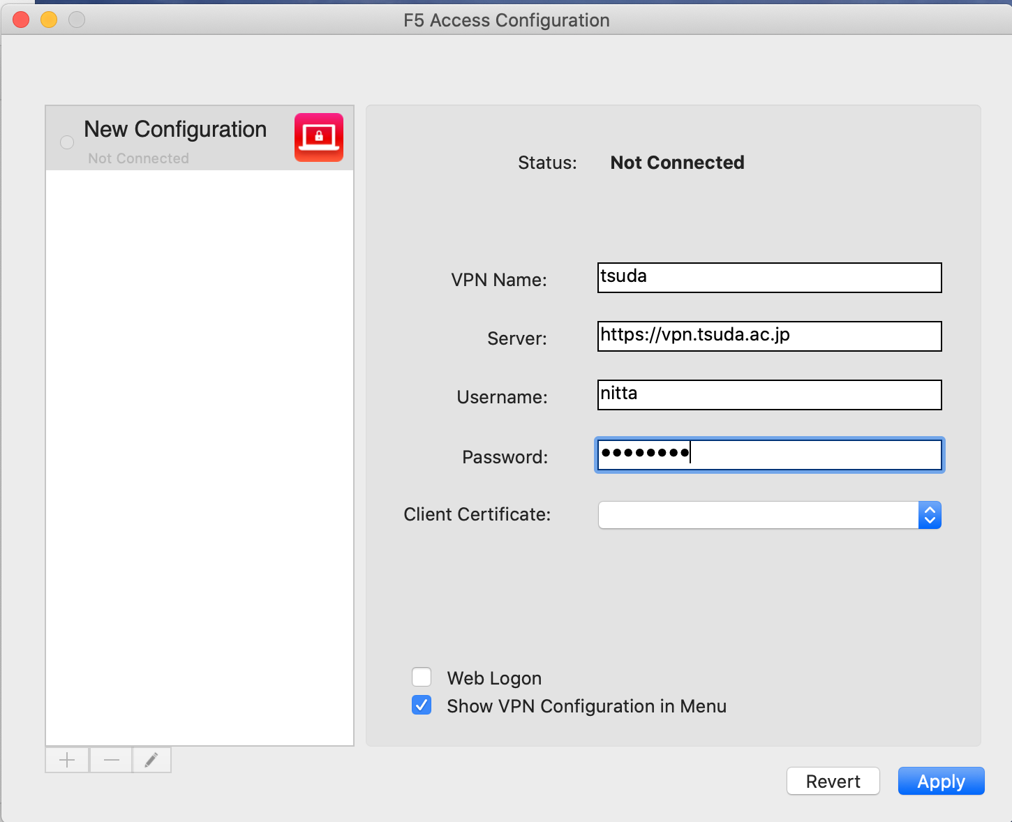 VPN Name: わかりやすい名前をつけて下さい Server: https://vpn.tsuda.ac.jp Username: 津田塾大学計算センターのアカウント Password: 津田塾大学計算センターのパスワード