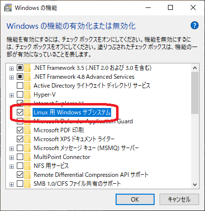- 「Linux用Windowsサブシステム」 "Windows subsystem for Linux" にチェックを入れる(= 有効化する)。
