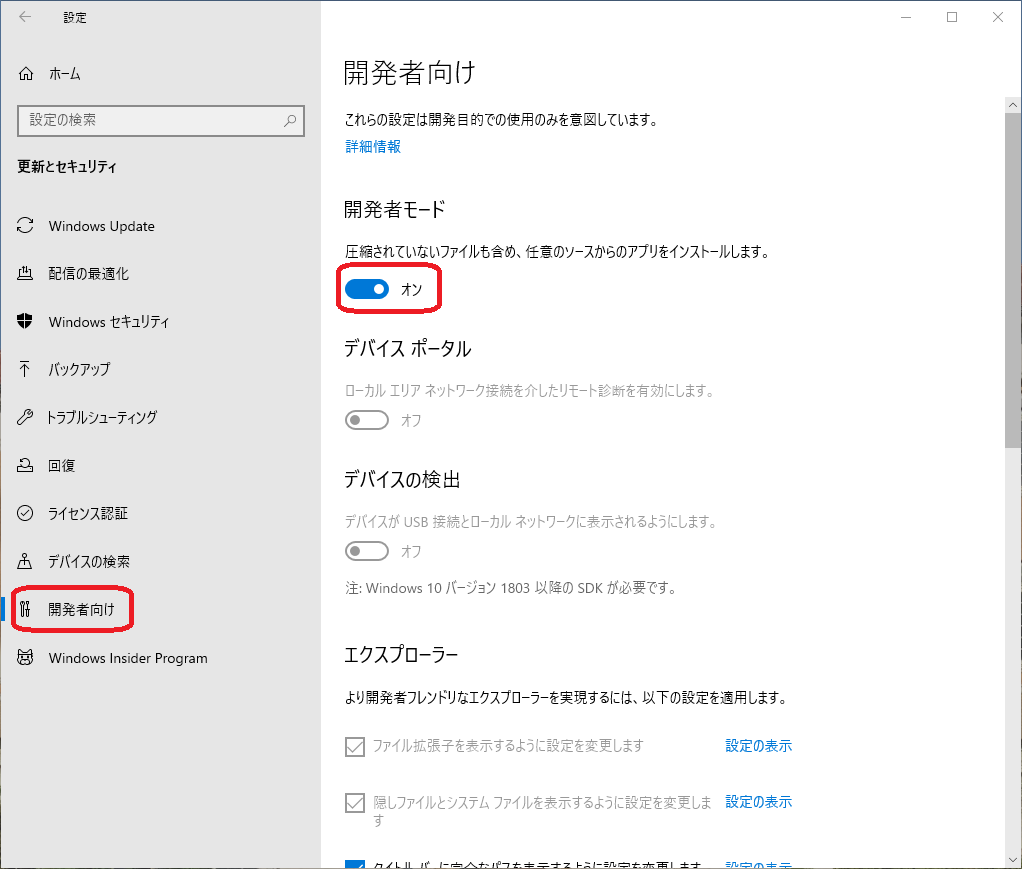 - 「設定」→「更新とセキュリティ」→「開発者向け」において「開発者モード」を「オン」にする。