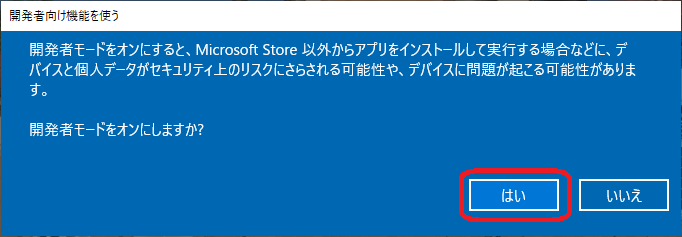 - 危険性を指摘したうえで「開発者モードをオンにしますか?」と確認を求められるので「はい」をクリックする