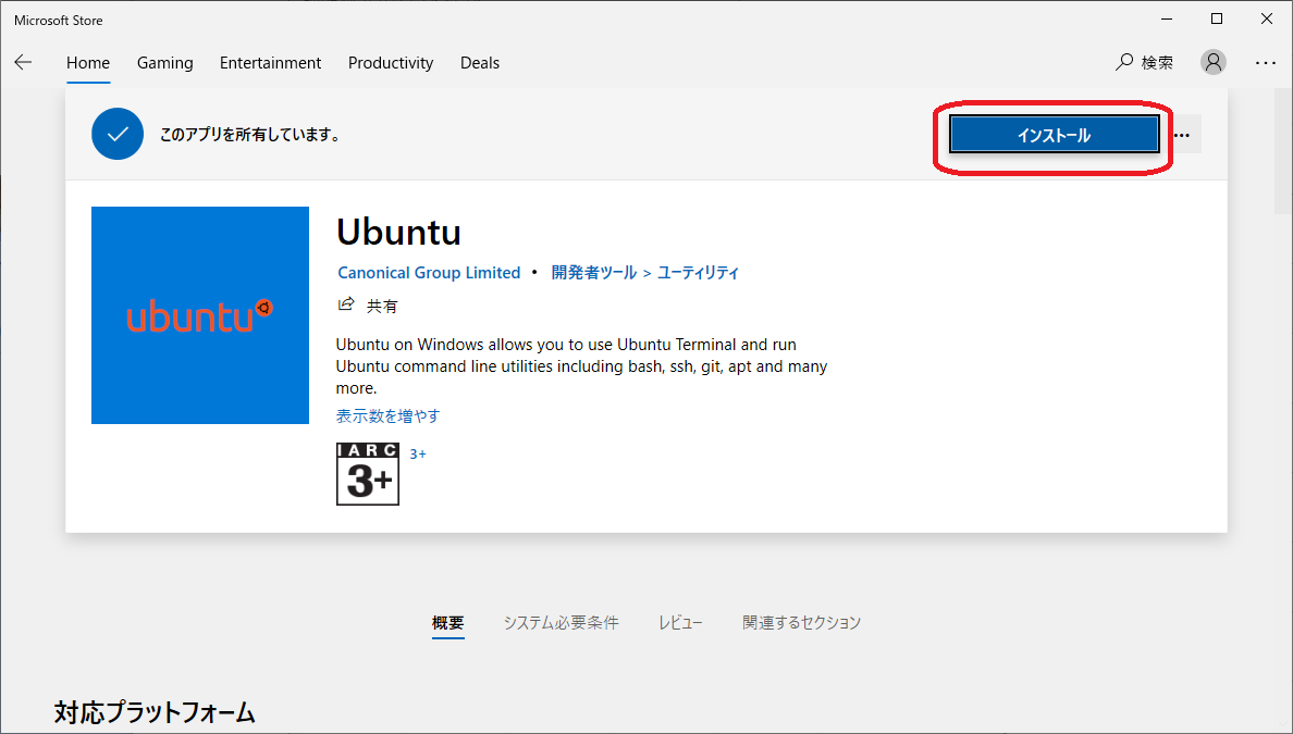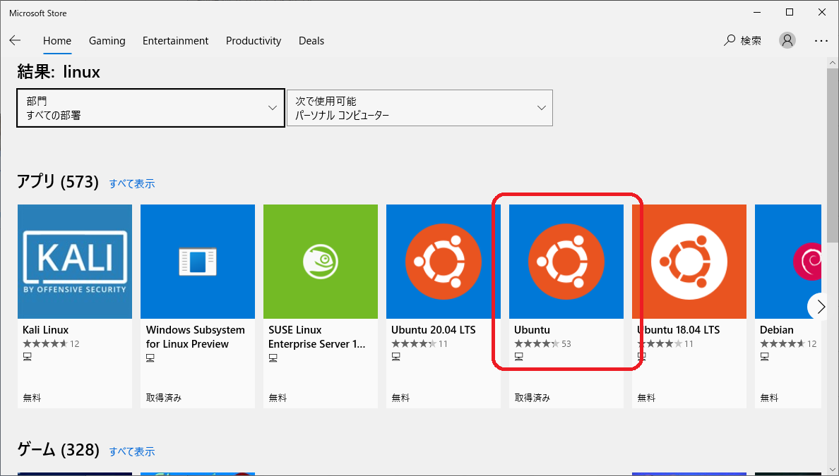 - Windows Store を起動し、"linux" を検索する。または、https://aka.ms/wslstore にアクセスしてもよい。