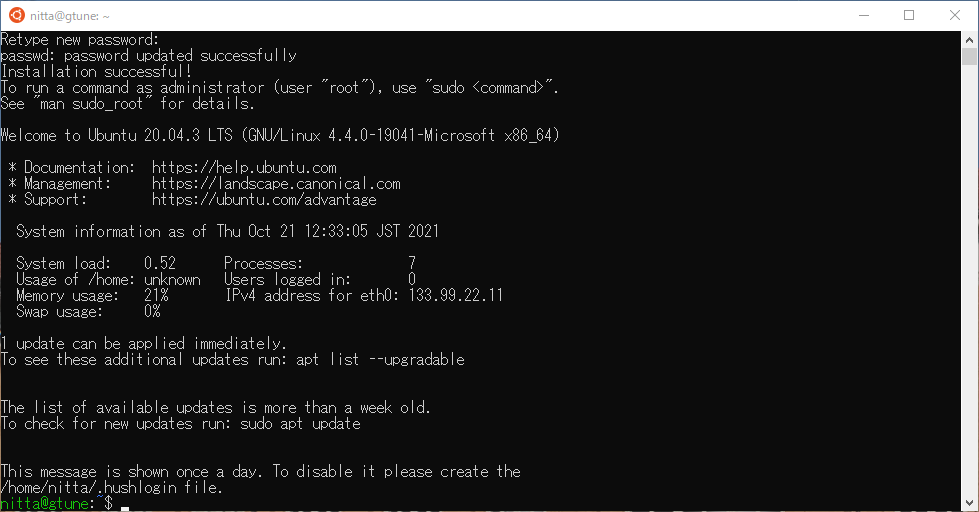 [sudo] password for nitta: → 自分のパスワードをタイプする。