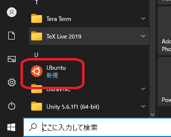 - 以後、「スタートメニュー」から「Ubuntu」を選択すると bash が起動する。