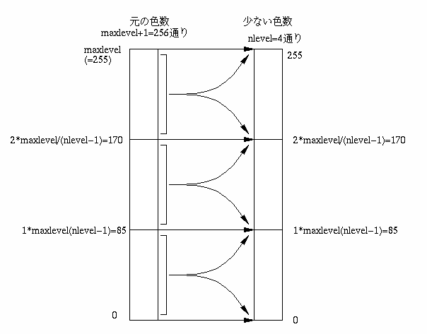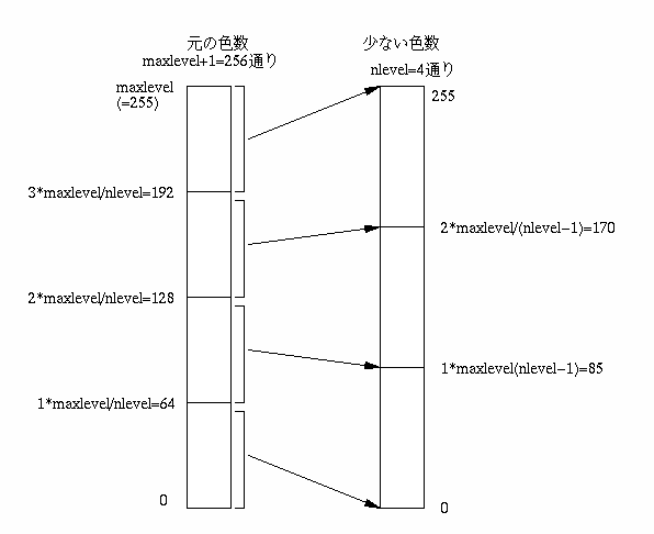 赤、緑、青の原色のうちどれか1つのの色に注目して考えます。 ある原色の明るさが 0 〜 maxlevel の範囲(すなわち maxlevel+1通り)で 表現されているとします。 これを nlevel 通りの明るさにマップしなければならなくなったとすると、 (maxlevel+1)通りが nlevel 通りに対応づけられるので、もとの明るさを (maxlevel+1)/nlevel の長さに分割して考えればよいことになります。 すなわち、元の明るさが x であったとすると、これは 0〜 (nlevel-1) の範囲のうち x * nlevel / (maxlevel+1) 番目にマップされるわけです。
