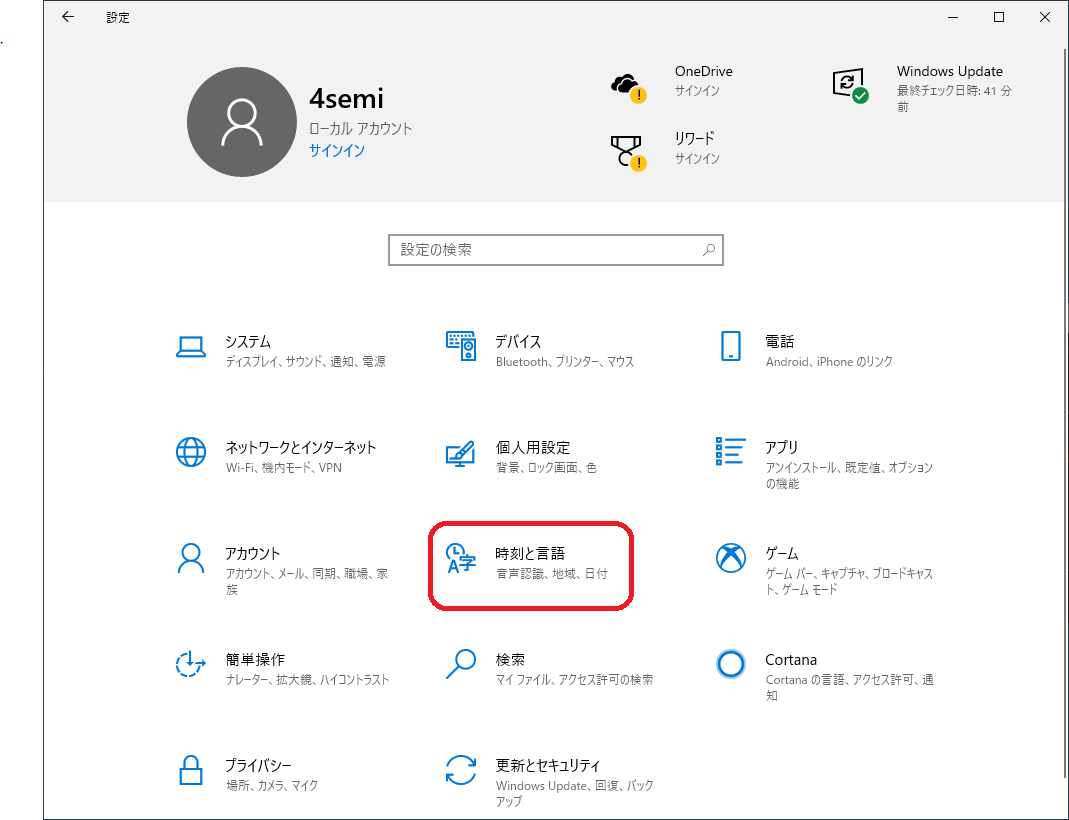 - 左下のスタートを右クリックし、「時刻と言語」を選択する。