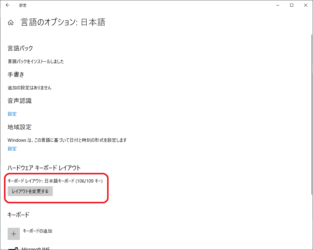 - >「ハードウェアキーボードレイアウトの変更」で「日本語キーボード(106/109キー)」を「英語キーボード(101/102キー)」に変更する。